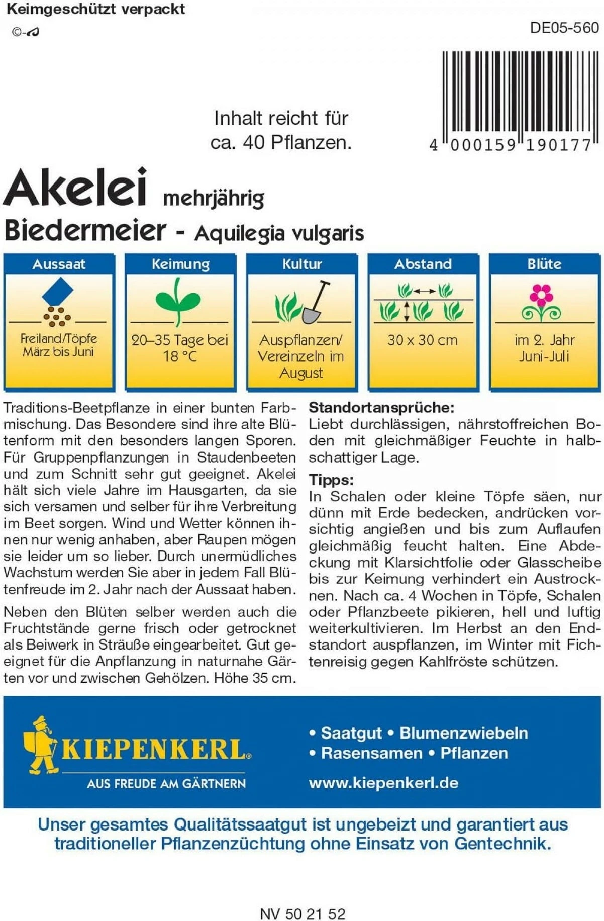 Pianta da aiuola tradizionale adatta anche per ottenere dei bellissimi fiori recisi. L’aquilegia rimane nel giardino di casa per molti anni, perché si autosemina. Il vento e il maltempo non sono un problema, l’unica accortezza da prendere è proteggere la pianta dai bruchi. La pianta cresce instancabile, raggiungendo un’altezza di 35 centimetri, e fiorisce nel 2° anno dopo la semina.