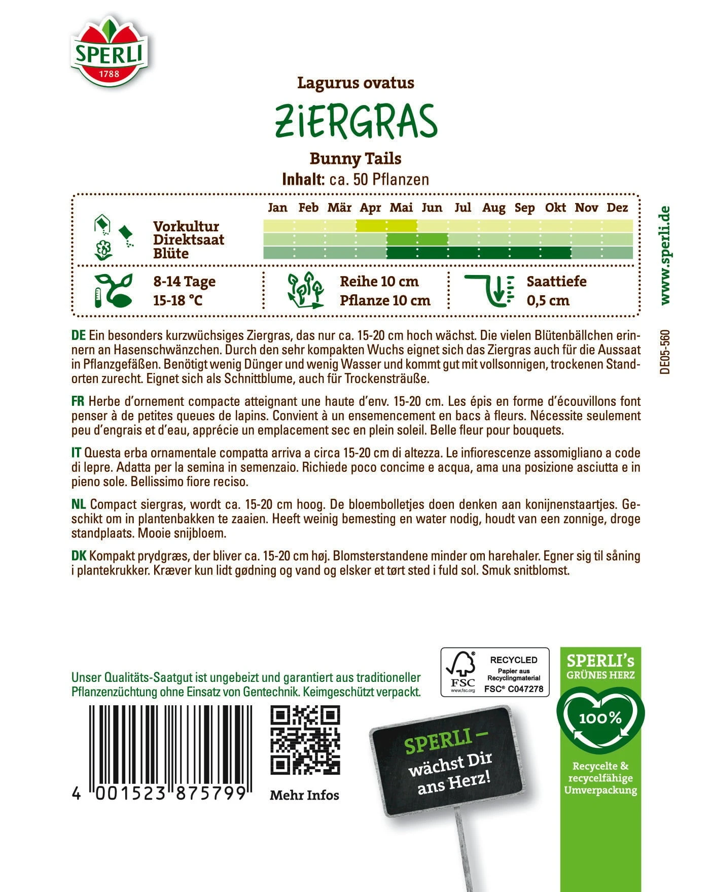 Questa erba ornamentale annuale raggiunge un’altezza di circa 20 cm ed è ideale come tappezzante. Le infiorescenze somigliano a code di lepre e sono bellissime anche come fiore reciso.