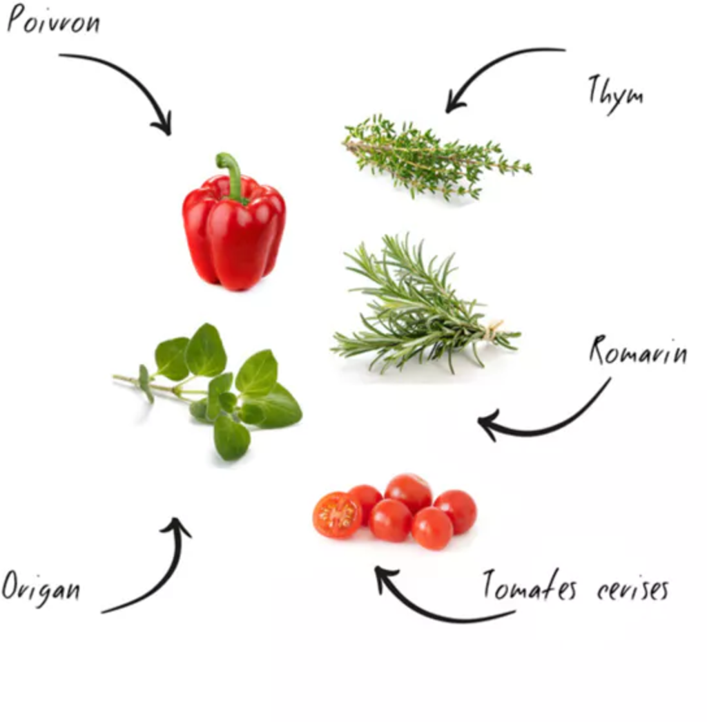 - 5 tipi di semi biologici: rosmarino, pepe, timo, pomodorini, origano.