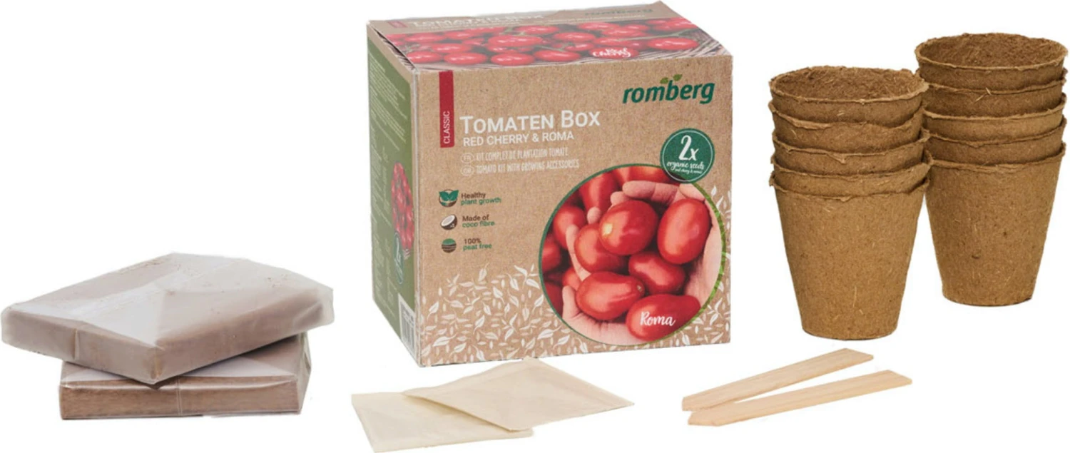 Con questo pratico set puoi facilmente coltivare e raccogliere deliziosi pomodori. Dotato di vasetti, terriccio, semi biologici e cartellini segnapiante, il kit ti permette di cominciare fin da subito la coltivazione dei pomodori nell’orto, in terrazza, sul balcone o sul davanzale.