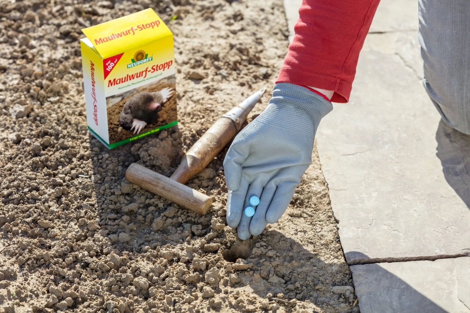 - Preventivo: utilizzare un bastone o una vanga per praticare dei fori nel terreno profondi circa 10-20 cm a una distanza di un metro e inserirvi 1-2 gocce. Quindi richiudere.